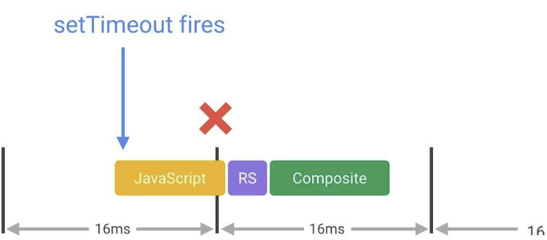 setTimeout은 frame 생성과 상관없이 주기적으로 동작하기 떄문에 frame 시작 시간이 아닌 중간이나 끝에 trigger될 수 있으며 이는 frame을 잃게될 가능성이 높아진다. 반면에 requestAnimationFrme은 다음 repaint 전에 callback을 실행하기 때문에 frame 주기에 맞춰 실행된다. 이는 frame drop의 가능성을 낮춰주며, 모니터의 주사율(Hz)에 따라 다르게 동작할 수 있게한다. 또한 페이지가 비활성 상태일 때 그리기가 중단됨으로 callback이 실행되지 않아 resource를 절약할 수 있다(setInterval은 관계 없이 동작).