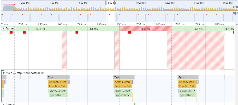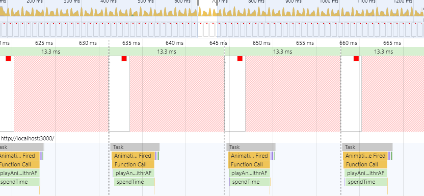 requestAnimationFrame을 사용함으로써 보다 안정적으로 frame을 생성할 수 있게 되었지만 callback에서 처리할 내용이 많아 시간이 (16ms보다)오래 걸리면 FPS가 낮아질 수 밖에 없다. js는 single thread 언어이기 때문에 js execution, layout, paint가 동일한 thread에서 진행되기 때문이다. 이를 위해 js의 실행 시간에 대해 신경을 써야한다.