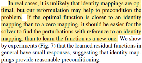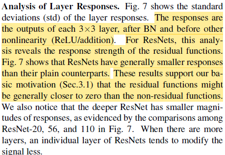 물론 실제로는 optimal이 identity mapping은 아닐테지만 identity mapping과 유사할 것이라 생각할 수 있고(직관적으로 layer가 많아질수록 각 layer를 통과했을 때 값이 많이 바뀌기보다 미세하게 변경될 것으로 생각할 수 있다. 깊은 모델일 수록 미세조정하는 hidden layer가 많을 것. 뿐만 아니라 Fig7에서 학습 이후에 residual layer의 response가 0에 가깝다는 것을 실험적으로 증명하였다.) 이는 reformulation이 문제를 해결하기 위한 좋은 전제조건이라 할 수 있다. 왜냐하면 ResNet은 HE initialization(~N(0, (2/n)^(1/2)))으로 weight를 설정하기 때문에 초기값이 0에 가깝고, 따라서 0에 가까운 optimal redisual에 쉽게 수렴할 수 있는 것이다.