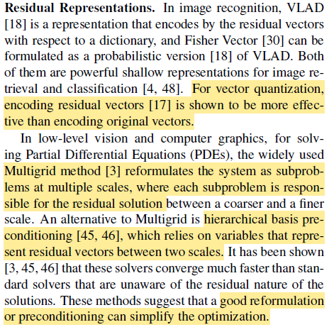 VLAD, Fisher Vector 라는 애들도 residual vector로 encoding해서 효과를 봤었고 Multigrid method, Hierarchical basis preconditioning도 scale에 대한 residual을 활용해서 빠른 converge를 할 수 있었다더라.