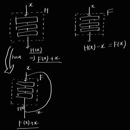 저자들은 이 문제를 해결하기 위해 residual을 학습하는 구조를 생각해냈다. 원래 학습하고자 했던 target function H를 학습하기 어려우니 H block의 residual인 H(x) - x를 output으로 하는 F를 대신 학습하려는 것이다. 정의에 따라 F(x) = H(x) - x 가 성립하고 다시말해 H(x) = F(x) + x가 된다. 즉, 원래 학습하고자 했던 target function을 잔차를 학습한 layer F + input 으로 변경할 수 있게 된다.