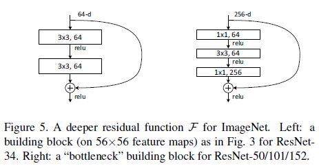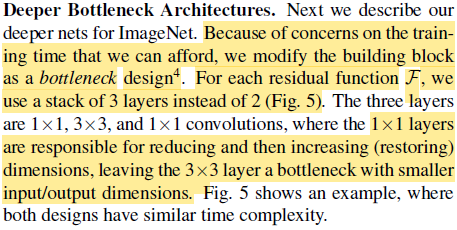 34 layer 이상으로 deep한 모델을 구성하기 위해 학습 시간을 고려해서 보다 효율적인 residual function F의 구조를 고안했다. 앞뒤로 1x1 conv를 붙여 차원을 줄이고 늘리며 가운데에는 3x3 conv layer를 둔다. 이는 layer를 더 deep하게 (34 -> 50) 만들지만 time complexity는 비슷하다.