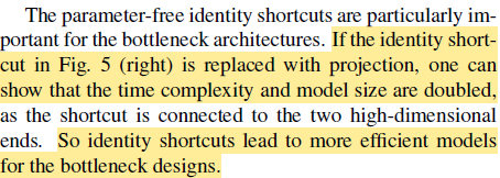 Bottleneck 구조로 변경하면 shortcut projection 비용이 훨씬 증가하기 때문에 identity shortcut이 bottlenect 구조에서 더 효율적이다.
