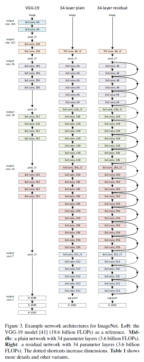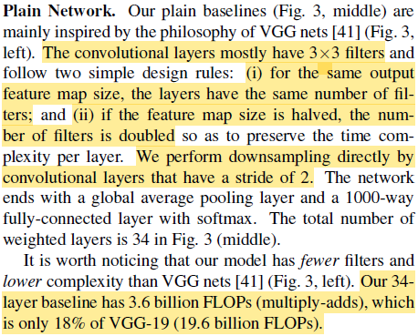 VGG에서 영감을 받았고 conv layer는 3x3을 사용한다. output feature map size가 같은 layer들은 filter의 수도 같게하고, feature map size가 반감될 때는 filter의 수를 두배로 늘려 각 layer의 complexity를 같게했다. 흥미로운 내용은 맨 처음부터 stride 2로 conv layer를 적용해서 feature map size를 바로 반으로 줄이고 시작한다는 점이고 후반부에는 GoogLeNet처럼 GAP, FC, Softmax로 결과를 뽑는다. 주목할만한 점은 34 layer로 구성했지만 19 layer VGG에 비해 겨우 18% 밖에 연산량이 되지 않게 했다 (같은 feature map size에서 사용하는 filter 수가 더 적음).