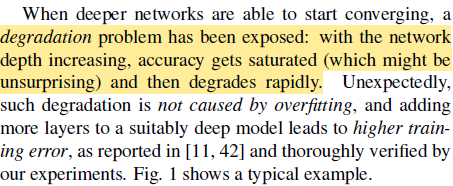 두 번째 문제는 Degradation problem (accuracy ↓)으로, depth가 깊어짐에 따라 정확도가 수렴하다가 빠르게 떨어지는 현상을 말하는데 이게 해결되지 않은 문제였다.