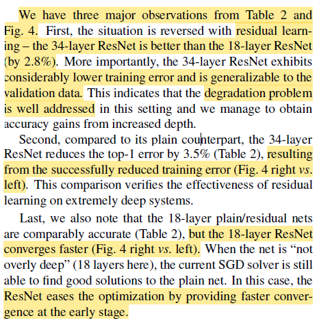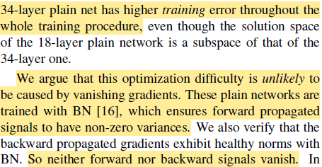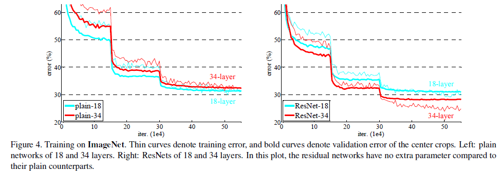 plain net의 경우에는 34 layer가 18 layer에 비해 전체적으로 더 높은 training error가 발생했다. 그 이유는 vanishing gradient 때문은 아니었다 (gradatation problem이다).