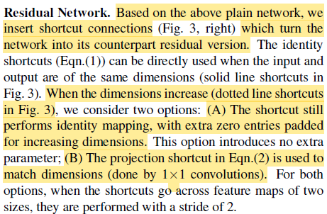 Plain net에서 shortcut만 추가해서 redidual을 학습하도록 했을 뿐이다. 다만 3.2에 언급한대로 차원이 달라지는 경우가 존재하는데 이 때는 (A) 추가된 filter를 0으로 채우거나, (B) 1x1 conv로 projection해서 차원을 맞추거나 하는 방법을 사용했다. 두 방법 모두 stride를 2로 해서 feature map을 줄였다(feature map의 홀수번째 cell은 버려졌다는 얘기).