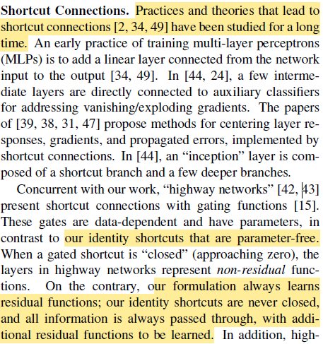 Shortcut connection도 오랫동안 연구된 내용인데 (Inception의 1x1 conv branch도 그렇고) 저자가 제안한 방식은 parameter를 추가로 사용하지 않고 그렇기 때문에 shortcut이 적용되지 않을 일도 없어서 좋다고 함.