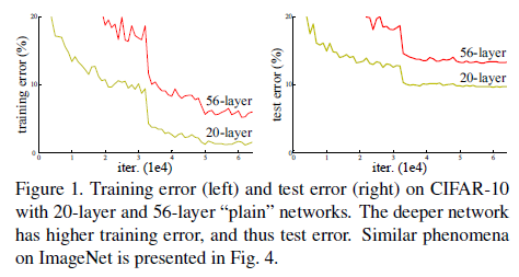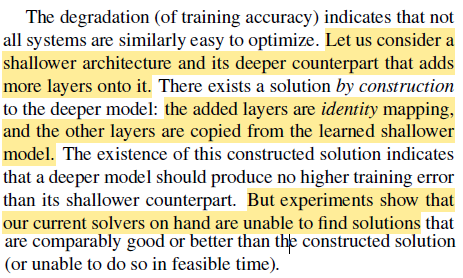 한번 "구조적으로" 생각해보자. 잘 학습된 얕은 모델의 layer의 가중치를 그대로 가져오고, 중간중간 identity mapping layer(input과 output이 같은 layer)를 껴 넣어 더 깊은 모델을 구성한다면 당연히 모델의 output이 같으니 training error는 증가하지 않을 것이다. 하지만 실험적인 결과는 달랐다. 지금까지 나온 방법들로는 이러한 구조를 갖는 모델을 학습시키기 어려웠고 오히려 accuracy가 떨어졌다.
