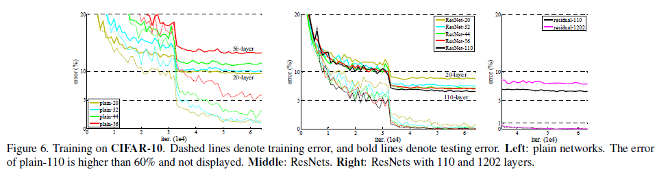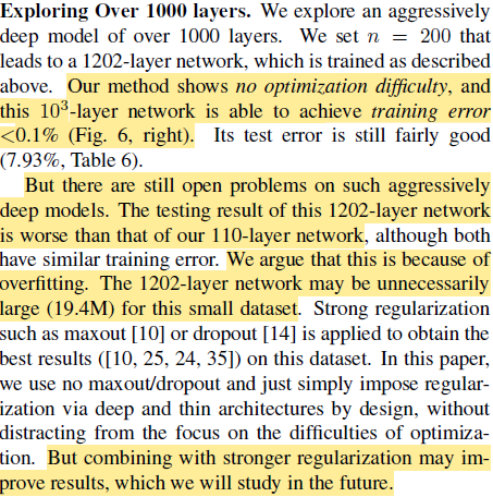 극단적으로 layer를 1000개로 늘려봤을 때 degradation 문제 없이 training error를 감소하는 것을 볼 수 있었다. 하지만 test error는 training error와 다르게 110 layer보다 성능이 떨어졌다(그래도 꽤 준수한 성능이긴 했다). 저자는 이를 CIFAR-10 dataset에 비해 모델이 너무 복잡해서 발생하는 overfitting 때문이라고 주장한다. 추가적인 정규화를 통해 이것 역시 좋게 할 수 있을 것이라고..