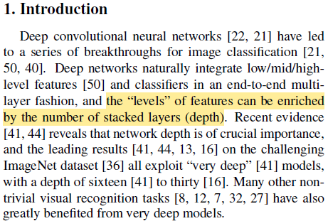 Deep learning에서 layer가 더 많이 쌓일수록 다양한 feature를 반영할수 있다는 다양한 연구가 존재해왔으며 layer의 depth가 중요하다는 사실은 계속해서 대두되었다.