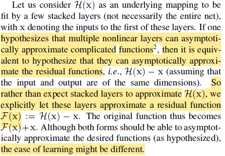 Introduction에서 한 얘기와 유사한 내용이다. Multiple nonlinear layers가 어떤 복잡한 target function H를 점진적으로 근사할 수 있다는 것은 F: H(x) - x 도 마찬가지로 근사할 수 있다는 말이다. 그러니 우리는 H말고 F를 학습하도록 할 것이다. 이게 더 학습하기 쉬우니까.
