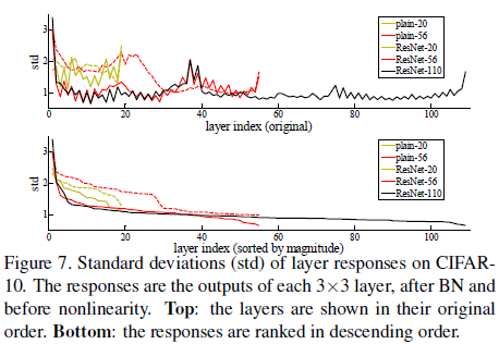 위 표의 y축 값은 학습된 resnet layer의 response strenth이다(output이 잔차라서 표준편차가 response strength라 할 수 있음). 3.1에서 예상한것처럼 identity mapping이 많아 resnet의 response는 plain에 비해 0에 가까웠고, 깊어짐에 따라 identity mapping이 더 많아져 zerro mapping을 하는 layer가 더 많아진 것을 확인할 수 있었다. 즉 깊어짐에 따라 각각의 layer는 input x에 대한 변경을 조금만 가하는 것이었다.