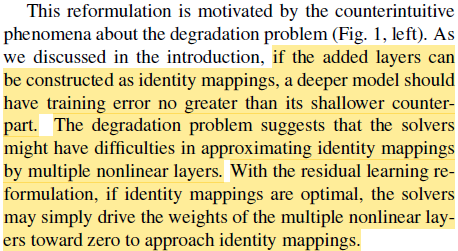 이러한 구조로 변경한 이유는 F를 학습하는 것이 H를 학습하는 것보다 쉬울 것이라고 생각했기 때문이다. Deep한 구조를 갖게되면 optimal model은 identity mapping layers와 유사한 hidden layers를 많이 갖고 있을 것이라 예상할 수 있는데(아래 실험에서 증명함), stacked nonlinear layers로 identity mapping을 학습하는 것은 쉽지 않은 일이다. 하지만 H가 identity mapping와 유사함에 따라 F는 zero mapping에 유사하게 되고 zero mapping을 학습하는 것은 비교적 간단한 일이된다.