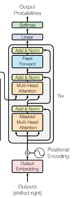 추가로, shifted right의 의미는 i-1 번째 token을 기준으로 i번째 token을 예측하는 행위의 index(position)을 align하기 위해 target sequence를 넣을 때 오른쪽으로 한칸 밀어서 넣는 트릭이다. (i-1번째 token이 i번째로 이동하면서 i번째 data로 i번째 output을 생성하는 꼴이 된다.)