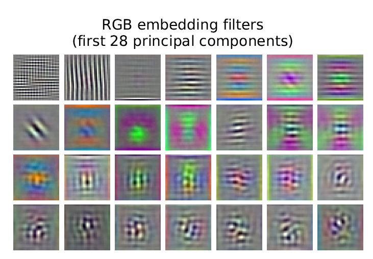CNN의 학습된 low level filter와 유사한 모습을 볼 수 있다. 즉, image low level feature(edge, color 등)를 잘 뽑아낼 수 있는 형태로 학습이 되어 있다는 의미이다. 2D geometrically feature를 뽑은 것이 아님에도 많은 dataset으로 학습하여 2D의 feature를 잘 뽑아낼 수 있게 되었다는게 포인트.