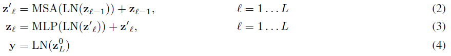 Transformer는 일반적인 transformer오 마찬가지로 하나의 block은 Multi head self attention layer와 MLP layer로 구성되어 있다.
