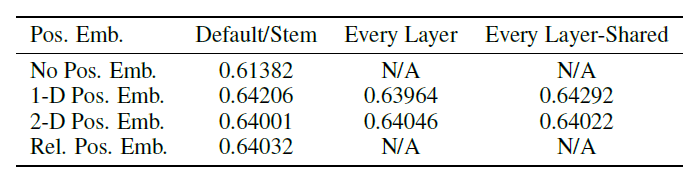 추가로 다양한 방식으로 positional embedding을 학습하도록 abblation을 해봤지만 차이는 미미했다. 이 이유는 patch 단위로 position이 들어가기 때문에 224 image 16 patch size라면 겨우 14x14개의 position 정보만 알면 되기 때문에 인코딩 방식은 별로 안중요하다고 함.