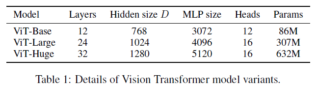 ViT는 model size별로 base, large, huge 세 가지로 나눴고 patch size 별로 16x16, 32x32로도 나눴다.