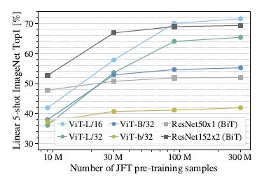 - 적은 dataset에서는 ViT-B/32, VitT-L/16은 overfit되어 성능이 좋지 않지만 30M부터는 ResNet50보다 좋아진다. 이는 CNN의 inductive bias가 smaller dataset에서 더 효과가 좋을 것이라는 직관에 대한 근거가 된다.