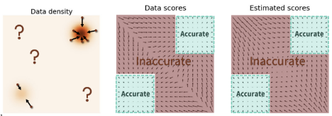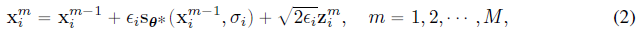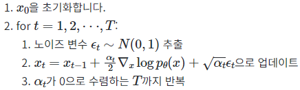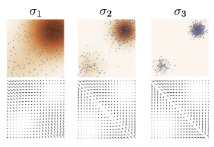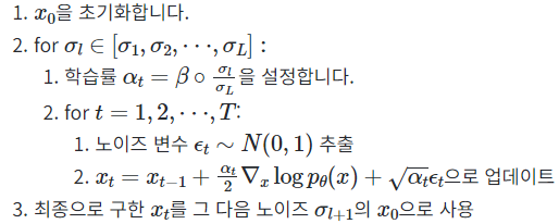 Langebin dynamic는 score를 가지고 데이터를 sampling 하는 방법을 말한다. 하지만 데이터가 적은 space에서는 gradient 값을 정확히 구할 수 없어 제대로 score를 학습하지 못하는 문제가 발생한다. 이를 해결하기 위해 단계적으로 noise를 줘서 각 noise에서의 score를 학습시킨다. sampling을 할 때는 큰 noise부터 작은 noise로 가며 latent image를 각 noise에서 converge하고 넘어가도록 한다. 이를 해결하기 위해 단계적으로 noise를 줘서 각 noise에서의 score를 학습시킨다. sampling을 할 때는 큰 noise부터 작은 noise로 가며 latent image를 각 noise에서 converge하고 넘어가도록 한다.