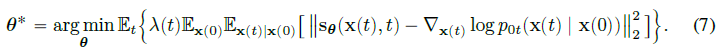 VE, VP, sub-VP SDE 모두 affin drift coefficient를 갖기 때문에 perterbation kernel p_σi(x | x0)은 가우시안 분포이고, 이는 (7)번 식의 계산을 간단하게해 학습을 효율적으로 하게 해준다.